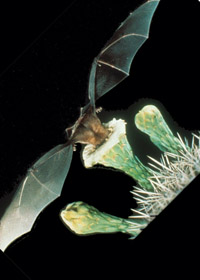 A bat eating nectar from a night-blooming cactus.