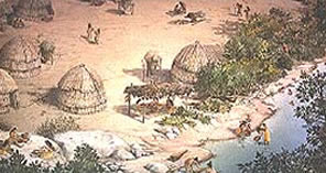 VillagesBay Miwok villages were small, consisting of 70 - 200 natives. The villages were built next to streams and creeks of the Mt. Diablo foothills so that fresh water was nearby. Some tribelets lived their permanently and some set up temporary villages on Mt. Diablo only during the harvest season. Houses in a village were placed in groups around a large open space. This open space was used for tribal ceremonies and gatherings. The Bay Miwok lived in round dome shaped structures called tule houses. These houses were built from the natural materials of the land - tules and willow branches. They ranged in size from six to twenty feet wide. Because of their size, an entire family of several generations lived in one house. The chief of the village always had the largest house. Home